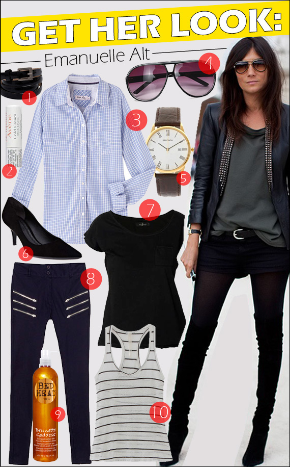 Para montar looks com o estilo despretensioso/chic de Emanuelle Alt, aposte em peças clássicas com modelagem revisitada e mais moderninha. Brinque com o jogo de justíssimo embaixo e mais masculino em cima, o resultado é um look “sexy” e poderoso! Pra copiar a moça, dê uma olhada nesse guia que eu montei e traz peças de R$18 a R$298!